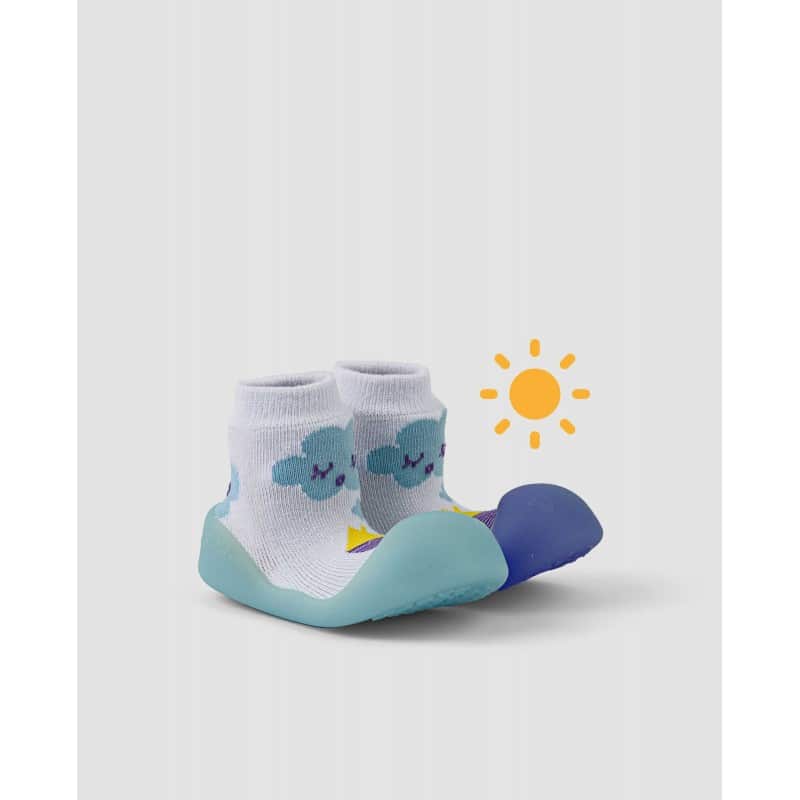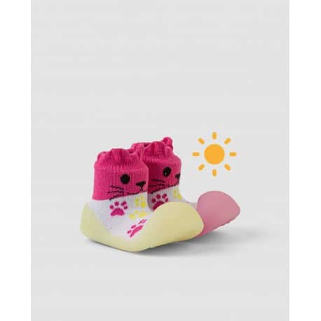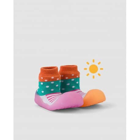 The soles of Chameleon shoes change color in reaction to sunlight or ultraviolet light. In the absence of light, the sole returns to its original color. This feature arouses toddlers’ curiosity, helps them feel more comfortable in their shoes and motivates them to crawl or walk between sunny and shady spots.