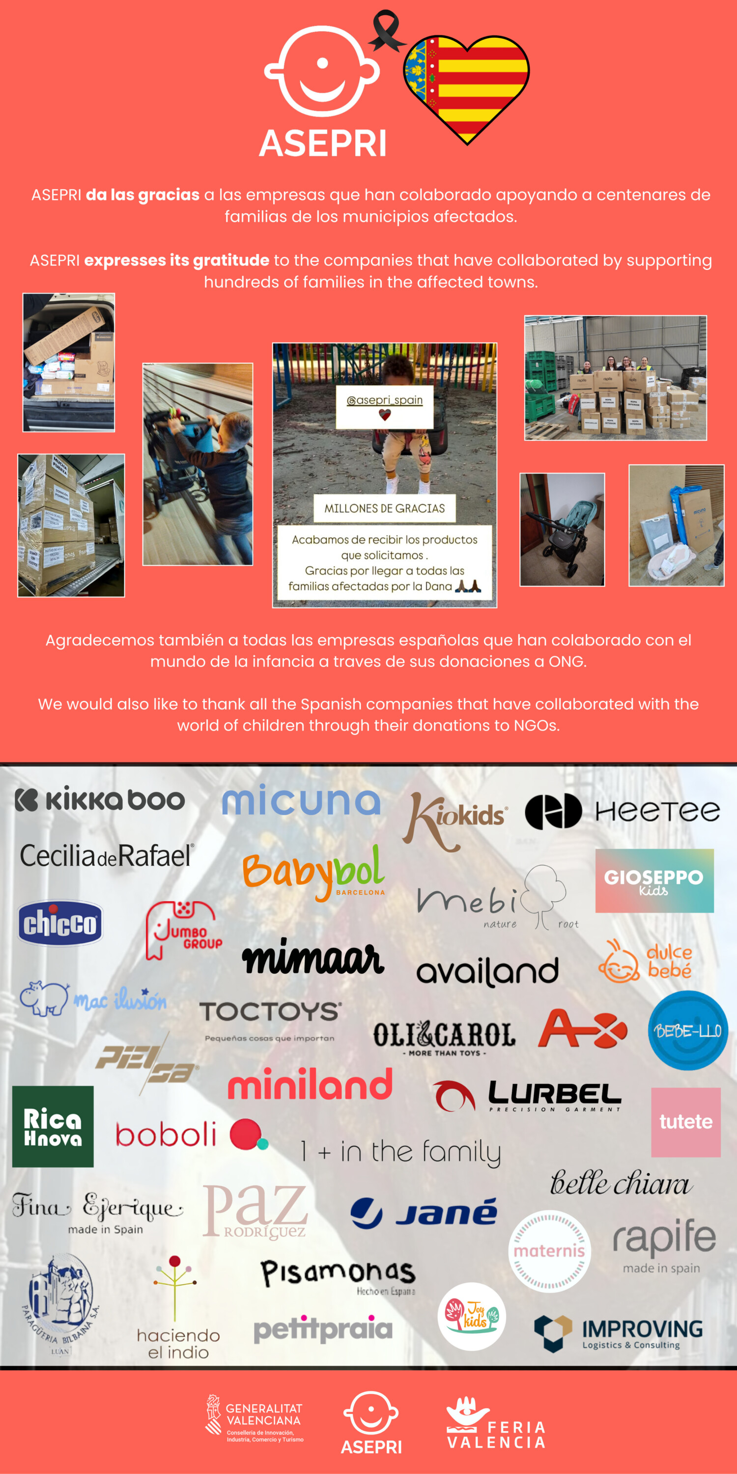ASEPRI da las gracias a las empresas que han colaborado apoyando a centenares de familias de los municipios afectados a través de la campaña solidaria por la DANA, así como a las empresas españolas y extranjeras que han colaborado por su cuenta con el mundo de la infancia afectado a través de sus donaciones a ONG y otras plataformas.